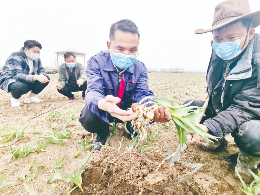 连日来,北辰区双街花卉博览园种植了20多亩三代郁金香,预计4月底陆续开放。同时,园区内还种有油菜花、大花满天星等10个品种,面积达200余亩。图为种植人员在进行技术交流。